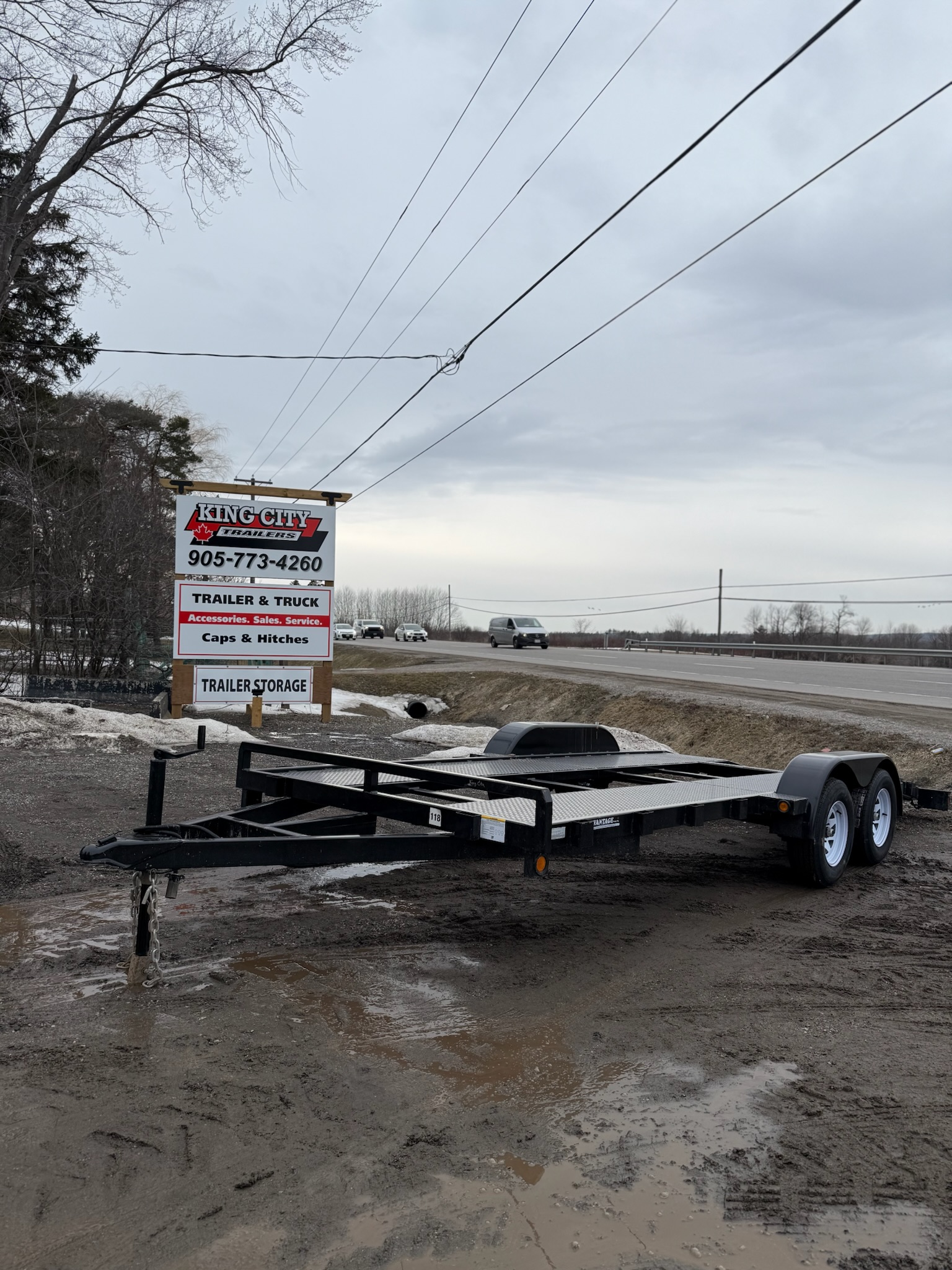 6.5′X18′ Galvanized Car Hauler. Tandem 3500 lbs Axles, Electric Brakes (1 Axle), 4′ Mesh Loading Ramps (Rear Stored), Checker Plate Deck with Open Center, Stake Pockets, 2-5/16″ Coupler, 2000 lb Jack, 14″ Radial Tires, LED Lighting.