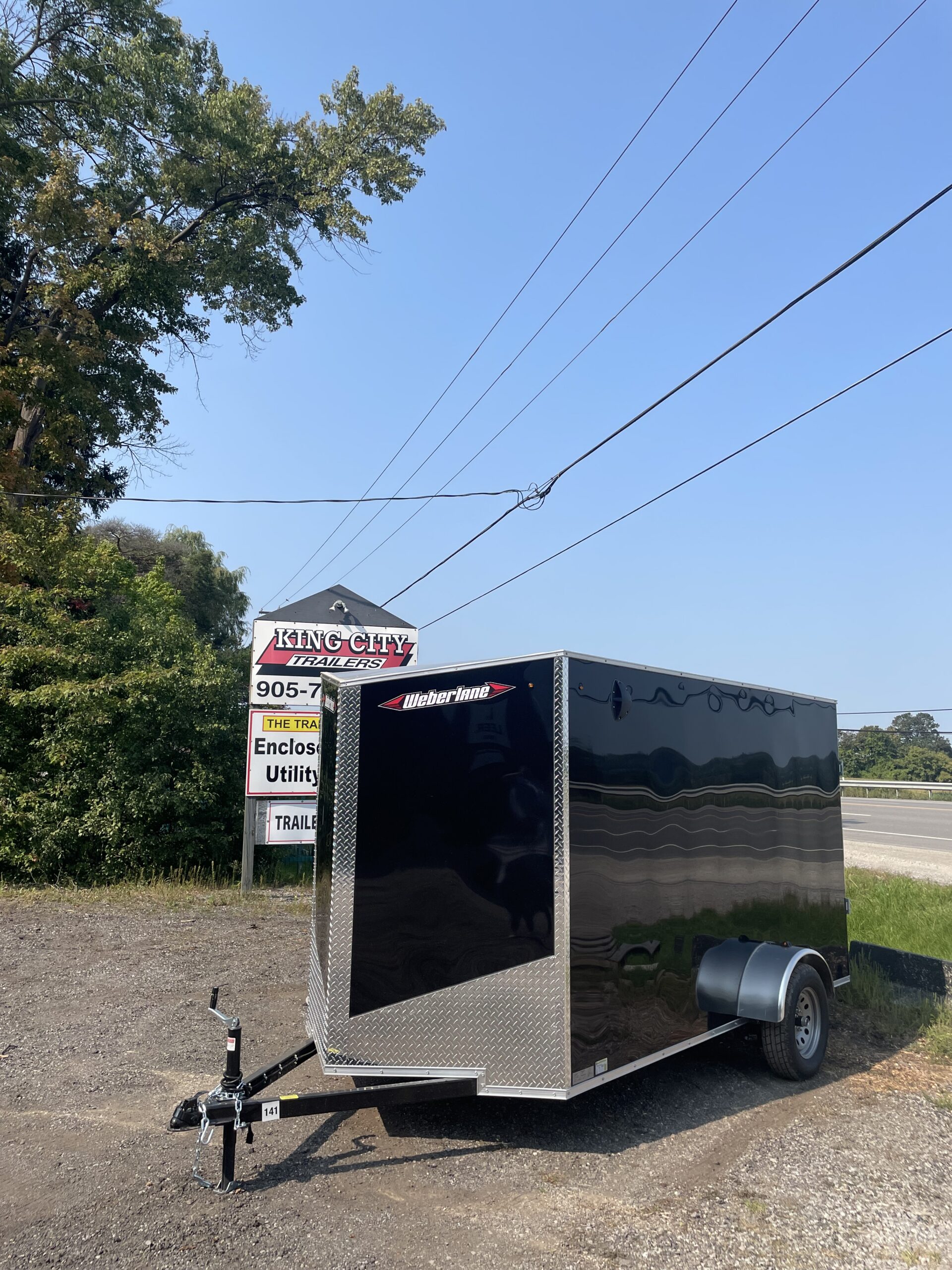 6×10 Estate Enclosed, Wedge Nose, Black, Rear Ramp Door, Screwless Sides, Aluminum Roof, Aluminum Fenders, Single Spring Axle w/EZ Lube Hubs, Radial Tires, 2″ 5000 lb Coupler, Jack, Interior Light.
